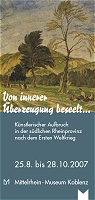 25. August 2007 - 28. Oktober 2007 Von innerer Überzeugung beseelt ... Künstlerischer Aufbruch in der südlichen Rheinprovinz nach dem Ersten Weltkrieg Gemeinschaftsausstellung von Hunsrück-Museum Simmern, Stadtmuseum Simeonstift Trier, Mittelrhein-Museum Koblenz und Schloßparkmuseum Bad Kreuznach Weiter ![]() |