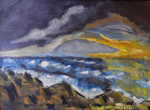 An der letzten Wand der Mitglieder des `Boots' zeigt Herm Dienz seine jüngste Wandlung. Seine Ölbilder sind in den Konturen kräftiger geworden als früher, und die Vertiefung ins Einzelne hat gesiegt. In der Gestaltung liegt klassische Ruhe mit Sturm und Drang. Während in der Landschaft Hachenburg" abgeklärte Stille herrscht, sind die Blumenstücke auffallend belebt, so daß `Alpenveilchen' mit seinem frischen Rot und Grün. Ein unruhiges Suchen nach eigener neuer Form äußert sich auch in seinen `Dahlien' mit dem schwer knisternden Vorhang, dem Nebenmotiv des Leuchters und den abgefallenen Blumen."41 | ||||||