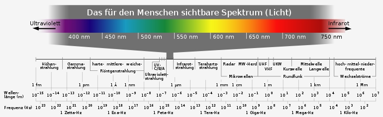 Lage des sichtbaren Spektrums im Gesamtspektrum elektromagnetischer Wellen |