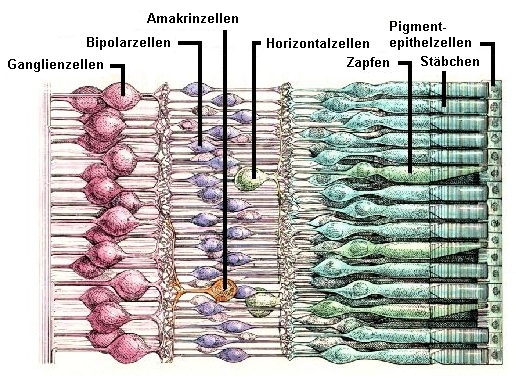 Struktur der Netzhaut. Das Bild zeigt einen Querschnitt, der einer Dicke von ca 0.25 mm entspricht. |