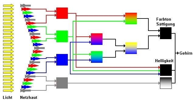| Die Netzhaut ist die lichtempfindliche Schicht im Inneren des Auges. Auf ihr befinden sich 100-120 Mio. Stäbchen- und 6 Mio. Zapfen-Fotorezeptoren. Die Fotorezeptoren sind mit 1 Mio. Ganglienzellen verschaltet, die wiederum direkt mit dem Sehnerv verbunden sind. Zwischen den Phtorezeptoren und den Ganglienzellen gibt es in der Netzhaut eine komplex aufgebaute Schicht aus Bipolarzellen, Horizontalzellen und Amakrinzellen, die zu unterschiedlichen Verschaltungen der Fotorezeptoren führen. Zapfen werden unterteilt in rotempfindliche L(ong)-Zapfen, grünempfindliche M(edium)-Zapfen und blauempfindliche S(hort)-Zapfen. Bei Tageslicht erstellt das Gehirn aus den Informationen der L-, M- und S-Zapfen ein Farbbild. Die Zapfen haben eine so geringe Empfindlichkeit, dass sie nur bei guten Lichtverhältnissen arbeiten. Stäbchen messen die Helligkeit des einfallenden Lichtes und liefern auch bei schwachen Licht einfache Schwarz-Weiß Bilder an das Gehirn. Bereits bei Dämmerlicht tritt bei den Stäbchen eine Sättigung ein, d. h. sie liefern nur noch helles Weiß als Helligkeitsinformation. Beim sogenannten Tagessehen (photopisches Sehen) empfängt das Gehirn Information über Farbton, Sättigung und Helligkeit, während beim Dämmerungs- oder Nachtsehen (skotopische Sehen) nur ein Graustufenbild empfangen wird. Die Auftrennung der Farbinformation in Farbton, Sättigung und Helligkeit spielt in der Farbtheorie eine wichtige Rolle. Insbesondere in der digitalen Bildverarbeitung sind Farbmodelle, die dieser Dreiteilung der menschliche Farbwahrnehmung folgen, besonders praxistauglich (siehe Abschnitt zum HSL-Farbmodell). | |||||||||||||||||||||
