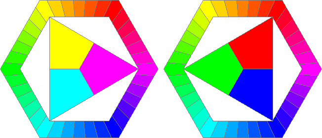 Das Farbsechseck mit den drei Primärfarben des Subtraktiven und Additiven Farbmischmodells |